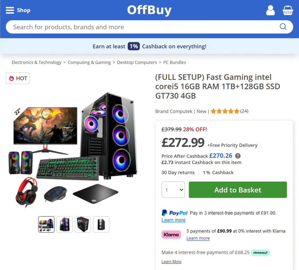 So, you search again, for “budget gaming pc”, aha! A result that’s under £400! Much better, let’s have a look… it could be on eBay, Amazon, or even a swanky custom website, but it’ll be similar to this: