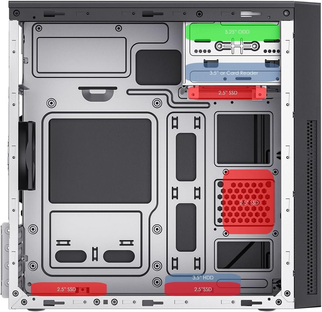 very good little case for the price. the build quality is evidently quite cheap, but it doesn’t impact the form or function whatsoever. product includes all the screws you need to mount basic stuff inside. i managed to fit a medium size gpu in no problem, but i think the larger 3060 & etc. would be a struggle.the front has slot to insert a disc drive, and underneath a smaller slot which i think can be used for sd card reader modules.